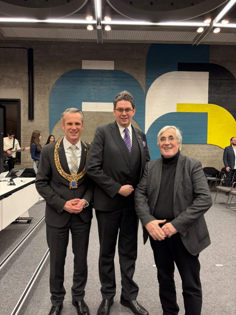 Simon Isser (Mitte) mit Oberbürgermeister Felix Schwenke (links) und BDAT-Ehrenpräsident Norbert Radermacher (rechts) bei der Verleihung der Bürgermedaille in Offenbach.