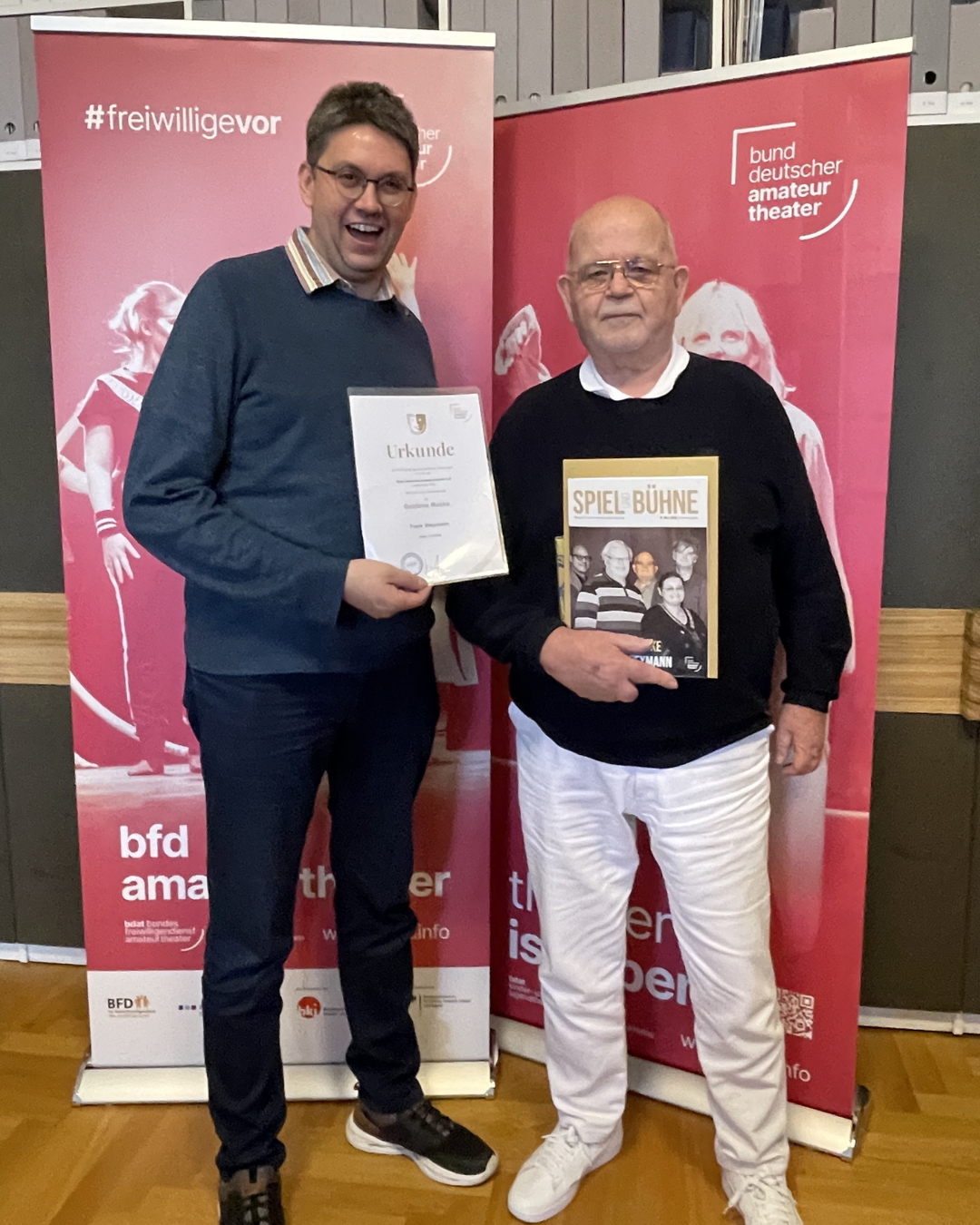 Mit dieser Ehrung würdigt der BDAT Frank Weymann für sein jahrzehntelanges, außergewöhnliches Engagement – insbesondere im Bereich der Öffentlichkeitsarbeit und als Fotograf des Amateurtheaters. Über viele Jahre hinweg hat er die Arbeit von Bühnen, Verbänden und Festivals sichtbar gemacht.