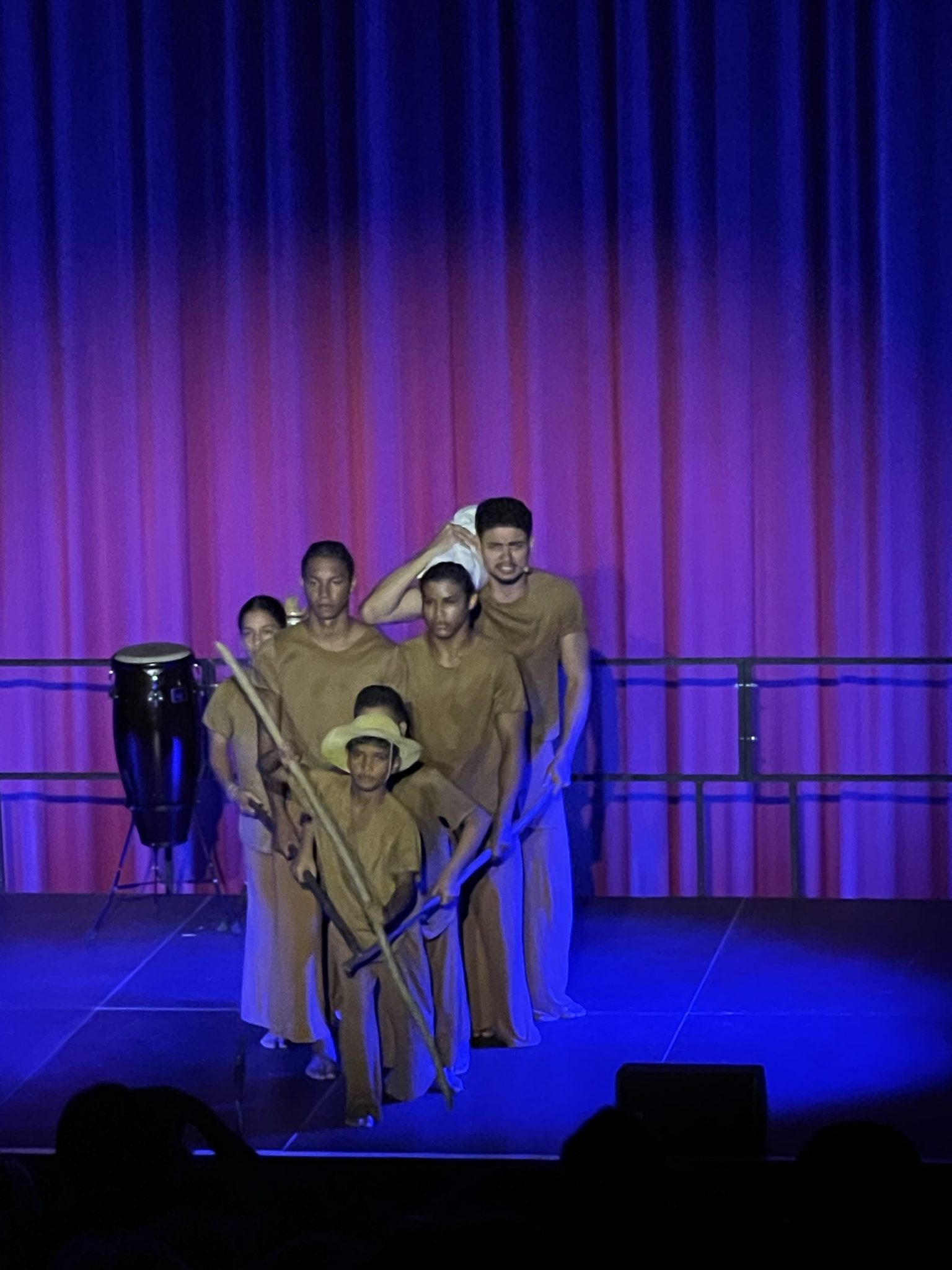 Nach so vielen Denk-Impulsen ist wieder Zeit für eine Pause und ich setze mich willkürlich erneut an einen langen Holztisch, unter grünen Bäumen und blauem Himmel, jetzt aber in neuer Besetzung. Wir zufällig gemeinsam Pausierenden kommen ins Reden, Kommentieren, Fragenstellen – über die von den Gruppen unterschiedlich eingesetzten Mittel und Spielformen: Requisite, Lichtdesign, Musik, Kostüme, Tanztheater, Bewegungstheater, Schattenspiel, Sprechtheater. Die Themen, die Herangehensweisen sind so divers wie die Herkunftsländer der Gruppen. Sie werden manch‘ interessierten Theatergänger*innen verständlicher, wenn die Spielleiter*innen im publikumsoffenen „Director’s Forum“ tiefere Einblicke geben, z. B. über das Theater in der Favela Rocinha, dem größten Armenviertel im brasilianischen Rio de Janeiro. Mit Elementen des Kampftanzes Capoeira, der auch ein Symbol für den Widerstand und die Identität der afrobrasilianischen Bevölkerung ist, spiegeln die jungen Darsteller*innen von „Acorda Capoeira“ ihr Selbstvertrauen wider und bringen ihre Stärke und ihren Lebensmut zum Ausdruck. Ihre Performance ist eine ästhetische Symbiose aus Musik, (Kampf)Tanz und Spiel, die sie in der Heimat auch Tourist*innen präsentieren. Ihre künstlerische Ästhetik ist für sie Statement und wichtige Einnahmequelle zugleich.