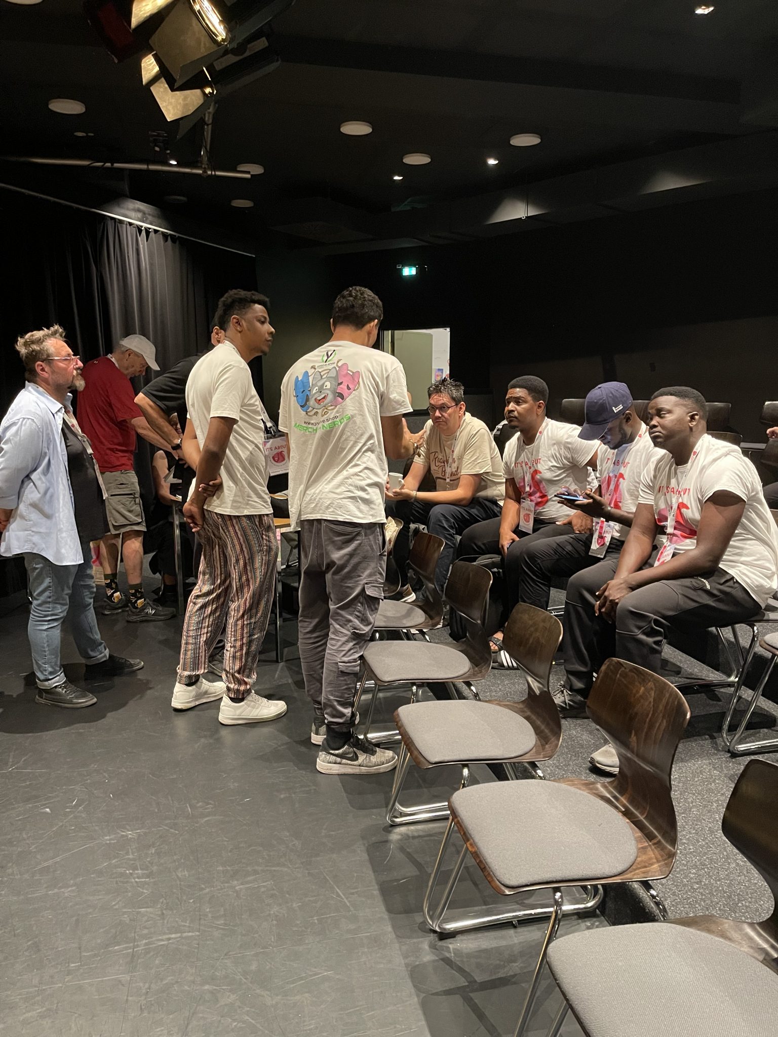 Die gute Stimmung setzt sich in den nächsten Tagen fort, wenn in der Warteschlange vor Beginn der Vorstellungen ein bunter Mix aus Menschen und Nationen steht: Theaterexpert*innen neben Theaterneulingen, Alt neben Jung, Griechenland neben Brasilien, Armenien neben Uganda, Lingener*innen neben Berliner*innen. Die Sprachen vermischen sich, Blicke werden getauscht, Worte, Gestik und Mimik verschwimmen und münden in Verabredungen zur nächsten Aufführung, zum Familiennachmittag oder zum Kaffee am Nachmittag und Bier am Abend.