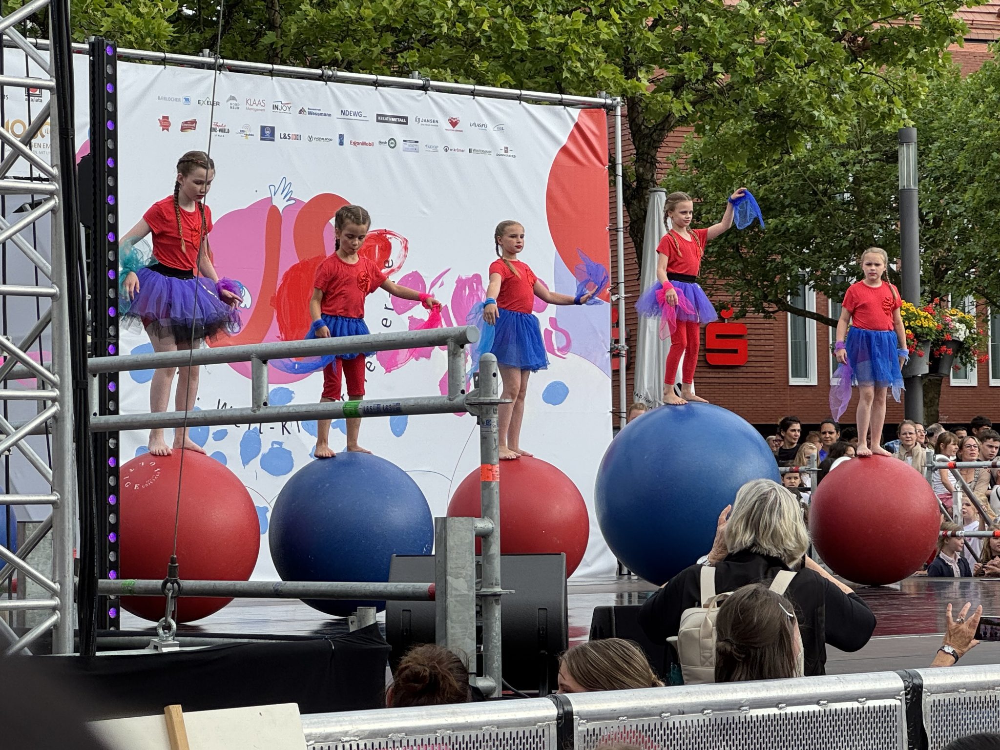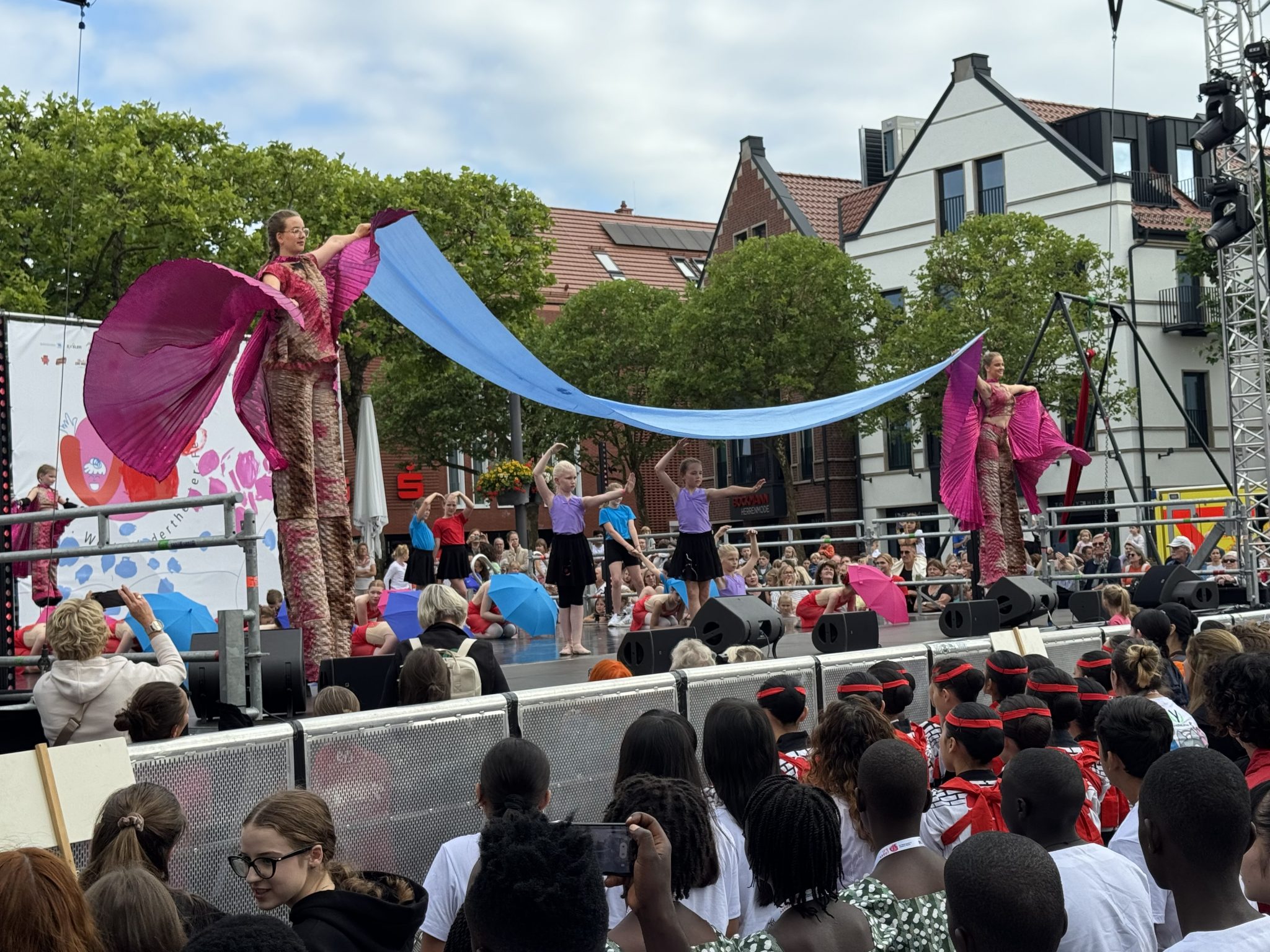 Der Himmel ist bewölkt, ein Knistern liegt in der Luft, die Vorfreude ist groß. Bunte Kostüme, lautes Lachen, leises Flüstern, freudige Wiedersehensbegegnungen. Letzte Regieanweisungen schweben über den Lingener Marktplatz im Emsland. Endlich geht es los. Die offiziellen Gruß- und Dankbotschaften werden mit steigender Publikumsnervosität verfolgt, es folgt ein buntes Willkommensprogramm der Lingener Theater- und Akrobatikjugend. Dann sind die teilnehmenden Theatergruppen aus 15 Nationen und 5 Kontinenten an der Reihe. Sie stürmen die große Marktplatz-Bühne und präsentieren sich und ihr Land laut und fröhlich vor internationalem Publikum. Mit Trommeln und Musik geht’s dann in einem bunten Umzug durch die Innenstadt zum Festivalgelände. Ab jetzt liegt das 16. Welt-Kindertheater-Fest für eine Woche in ihren Händen. Nach dem lauten Eröffnungsspektakel fühle auch ich mich leicht euphorisiert und freue mich darauf, mit alten und neuen Bekannten auf den Festivalbeginn anzustoßen.