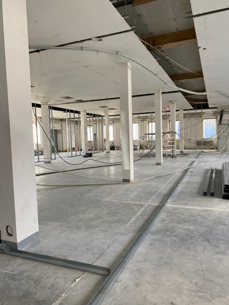 Anfang September standen wir als gesamter Verein in dieser großen, leeren Halle. Sie bot keinerlei theatertechnische Infrastruktur, fühlte sich aber sofort richtig an. Auch das alte Theater war einst aus einem Teilbereich einer ehemaligen Schokoladenfabrik entstanden. Nun bauen wir also wieder von Grund auf neu auf. Beleuchtung, Tribüne, Technik. Die Umwandlung dieses industriellen Raumes in ein voll funktionsfähiges, atmosphärisches Theater ist ein Projekt, bei dem jede Schraube, jede Rigipsplatte und jede Stunde ehrenamtlicher Arbeit doppelt zählt.