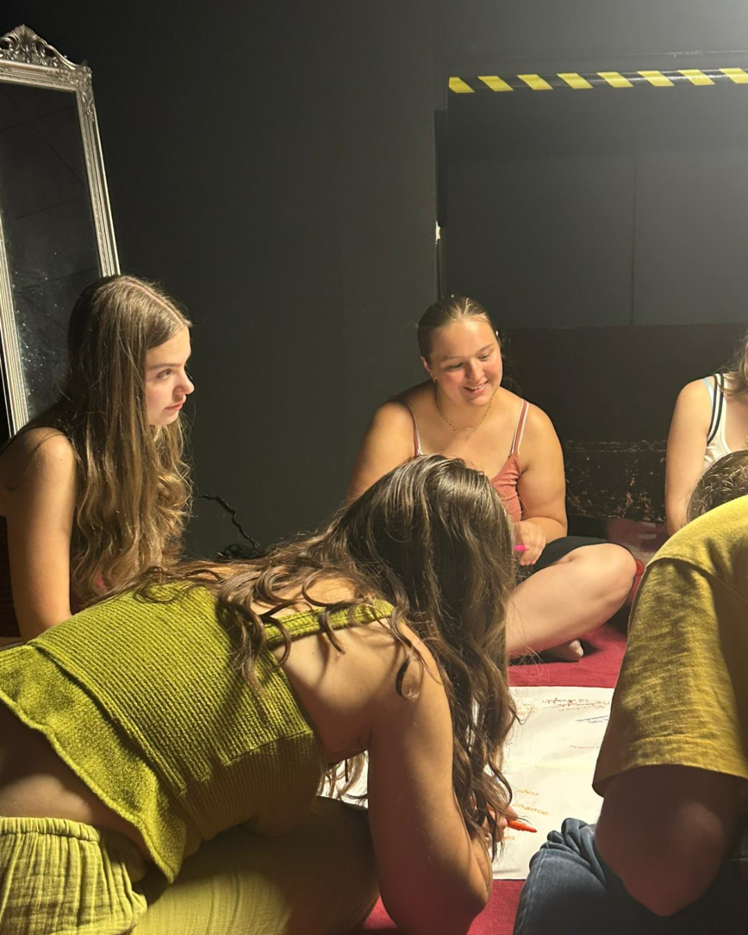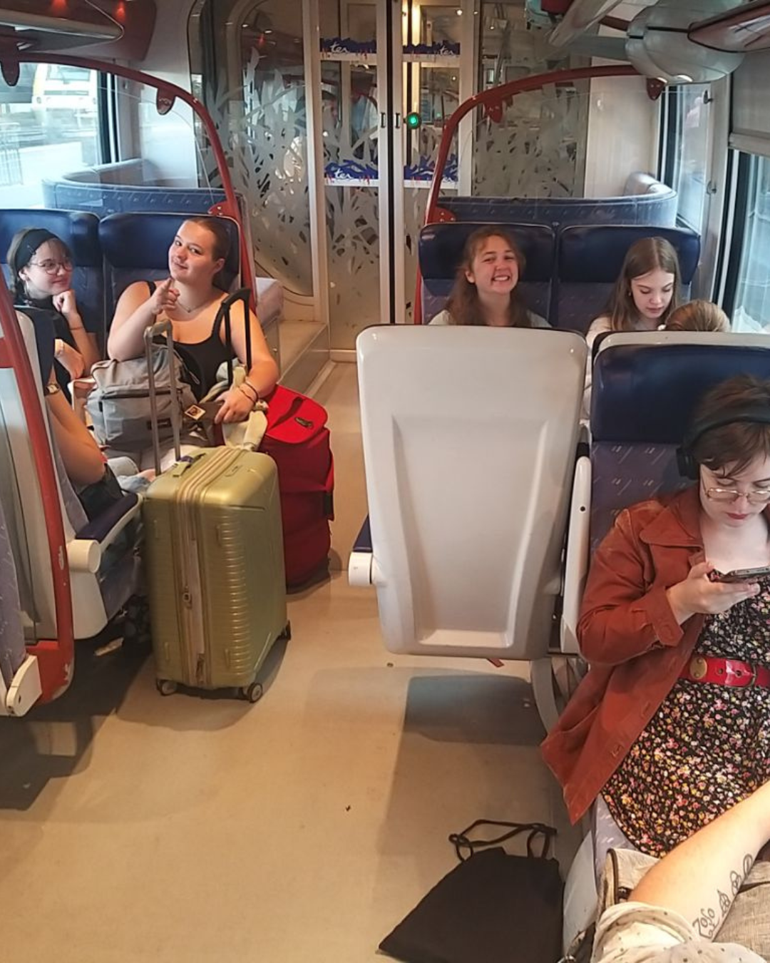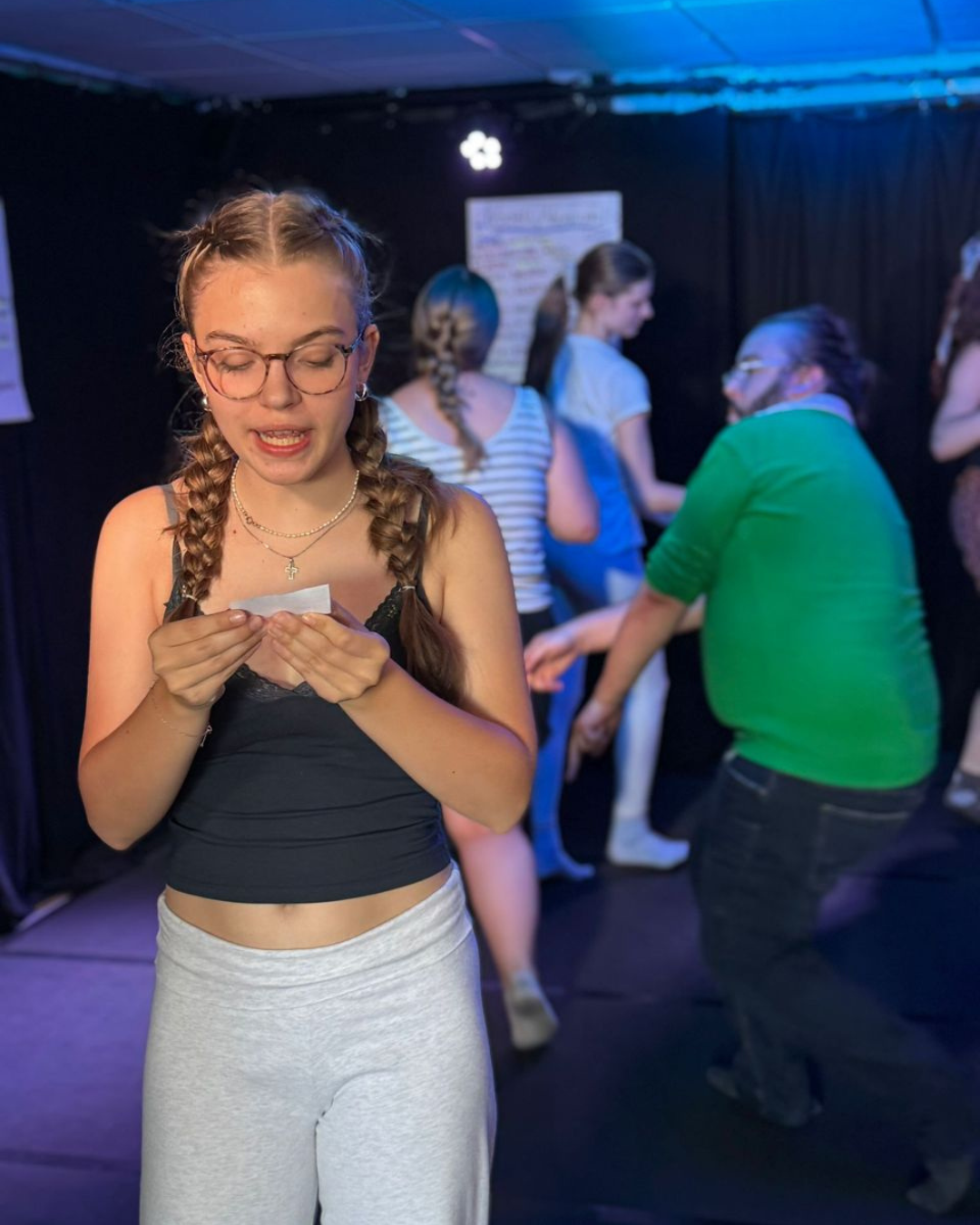 Und so machten wir uns nach der ersten erfolgreichen Aufführung schon auf den Weg nach Stuttgart. Mit einem kurzen Zwischenstopp in Straßburg kamen wir dank TGV schnell bei unserer deutschen Jugendherberge an. Die Temperaturen stiegen und unsere Müdigkeit mit ihr. Der klimatisierte Probenraum in den Räumlichkeiten des Landesverbands Amateurtheater Baden-Württemberg (LABW) entwickelte sich zu unserem größten Glück. Thea und Axel hatten Gnade mit uns und ließen die Theaterproben in den ersten Tagen etwas entspannter angehen. Louise gestaltete mit uns einen Vormittag im Sinne der Sprachanimation rund um das Thema Identität und Privilegien. Audiomaterial aus diesem Tag wurde sogar aufwendig ins Stück geschnitten und gestaltete bewegende Übergänge. Fragen wie „Wurdest du schon mal für deine Sprachkenntnisse gelobt?“ oder „Würdest du gern mal in einem anderen Land leben?“ besprachen wir in Kleingruppen. Oft entwickelten sich die Antworten tiefgreifender als erwartet und regten so zum Denken an, auch über die eigenen Vorurteile oder Privilegien.