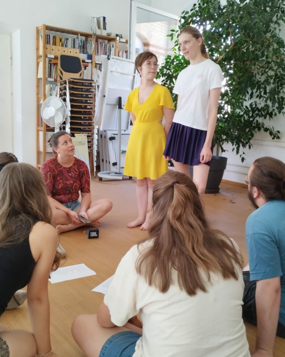 Durch viele Improvisationsübungen in Gruppen entstanden ganz spontan eigene kleine Szenen. Darin wurden wir von Geburtstagsgästen zu einem Fischschwarm und fragten einander, warum denn die Ohren grün und die Beine aus Holz seien. So verging die Probenzeit immer wie im Flug. Das hervorragende Mittagsbuffet von Vincent bot eine gute Zeit zum gemeinsamen Essen, Austauschen und neue Kraft tanken. Nachmittags besuchten wir die Stadt Stuttgart, ein kleines Festival und natürlich das Schwimmbad. Für die, die abends noch Energie hatten, standen außerdem eine Weinbergwanderung im Sonnenuntergang und das Spiel „Werwolf“ bei Nacht im Programm. Eine perfekte Mischung also, um den Sommer neben der Theaterarbeit zu genießen.